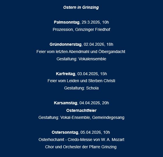 Liebe Grinzingerinnen und Grinzinger! Liebe Freunde unserer Pfarre! Einladung zum Konzert am Freitag, 27. März 2026 in unserer Pfarrkirche: Der Stadtchor Klosterneuburg singt das REQUIEM von Fauré und die „Abschied“-Symphonie von Haydn